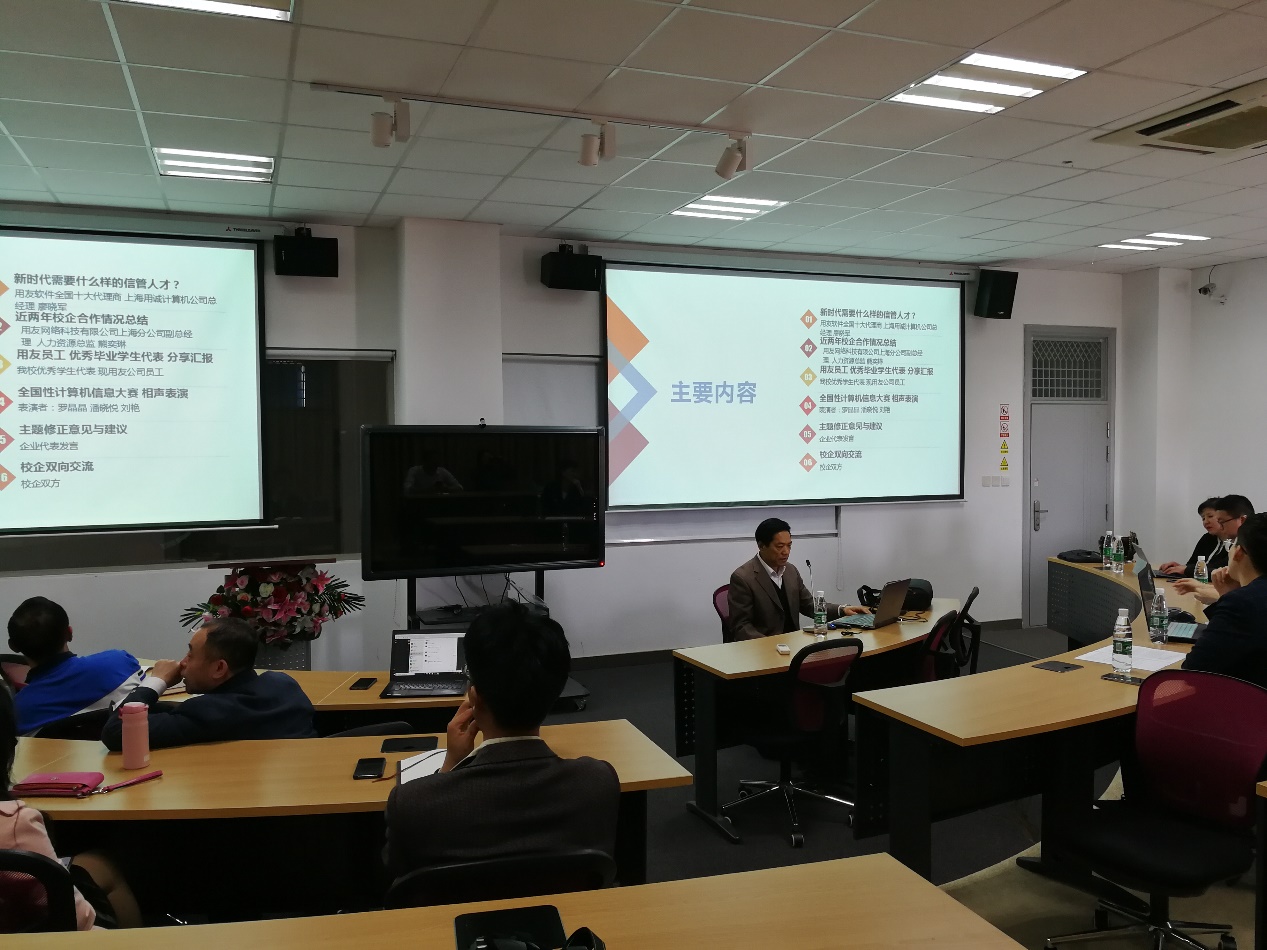 院长熊焰,副院长张金福,科研工作负责人于本海,用友网络科技有限公司上海分公司副总经理、人力资源总监熊奕琳,上海用诚公司总经理廖晓军,2018届信管专业的优秀毕业生,全系教师及学校教务处观摩教师共同参与了此次教研活动。