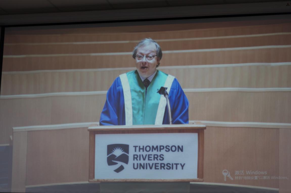 加拿大汤姆逊大学校长Brett Fairbairn教授通过视频为毕业生送上祝福,寄语毕业生要勇于实践、敢于担当、乐观生活,积极工作,希望同学们通过不断地努力成为社会栋梁和文化使者,进一步推动两国经济、社会与文化的交流与发展。