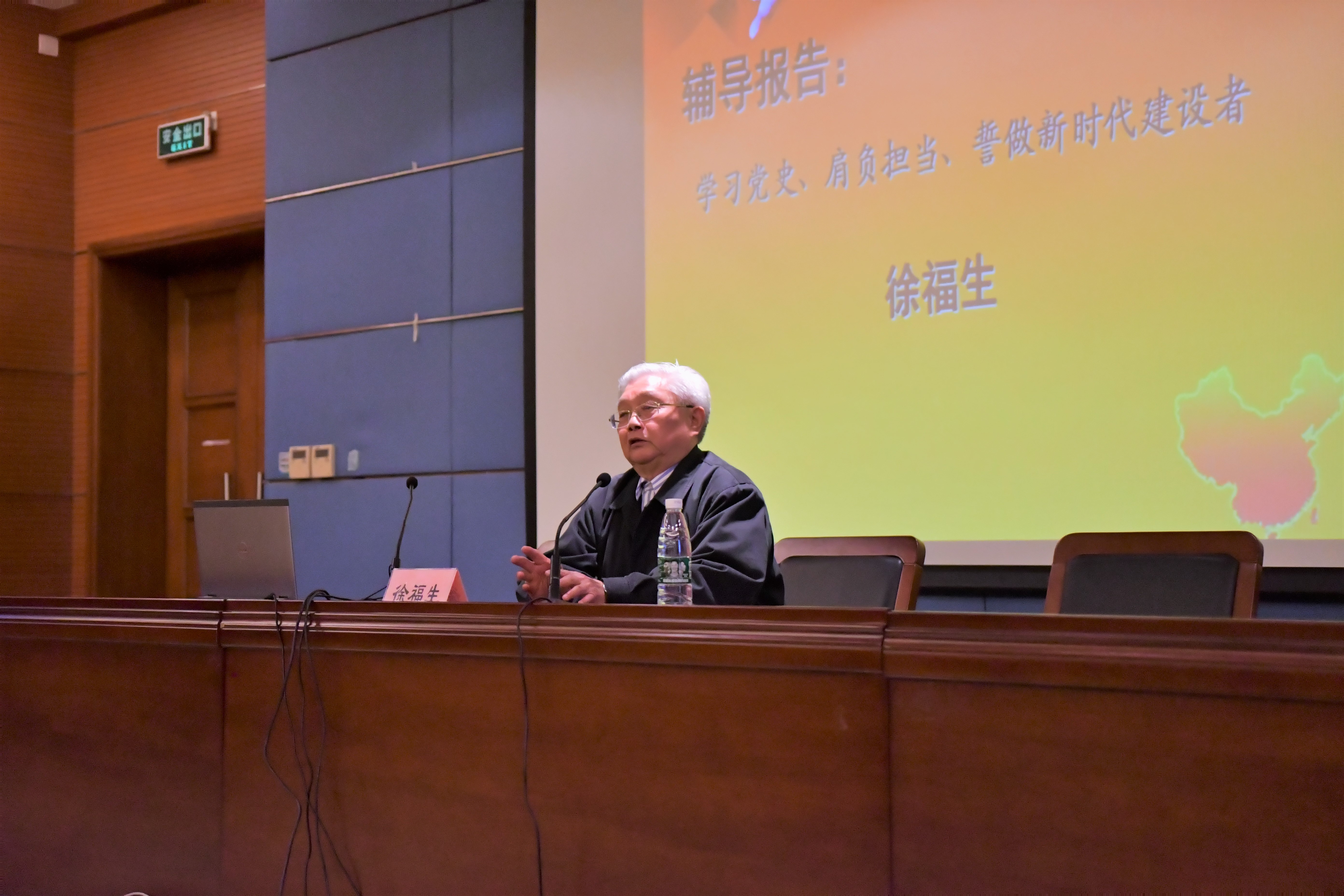 结业典礼结束后,学院邀请原上海市新闻出版局局长、文史馆馆长、上海百老德育讲师团讲师徐福生作“学习党史,肩负担当,誓做新时代建设者”报告,全体培训班成员参加了报告会。徐老以“人的生命很短,我们应该思考如何让自己的生命过的更有价值”为切入点,带领大家回忆了他的学生时代,从他和他同学的亲身经历出发,讲述了自己的心路历程,以此激励全体培训班成员努力学习党史,从而知史明智、知史担责。
