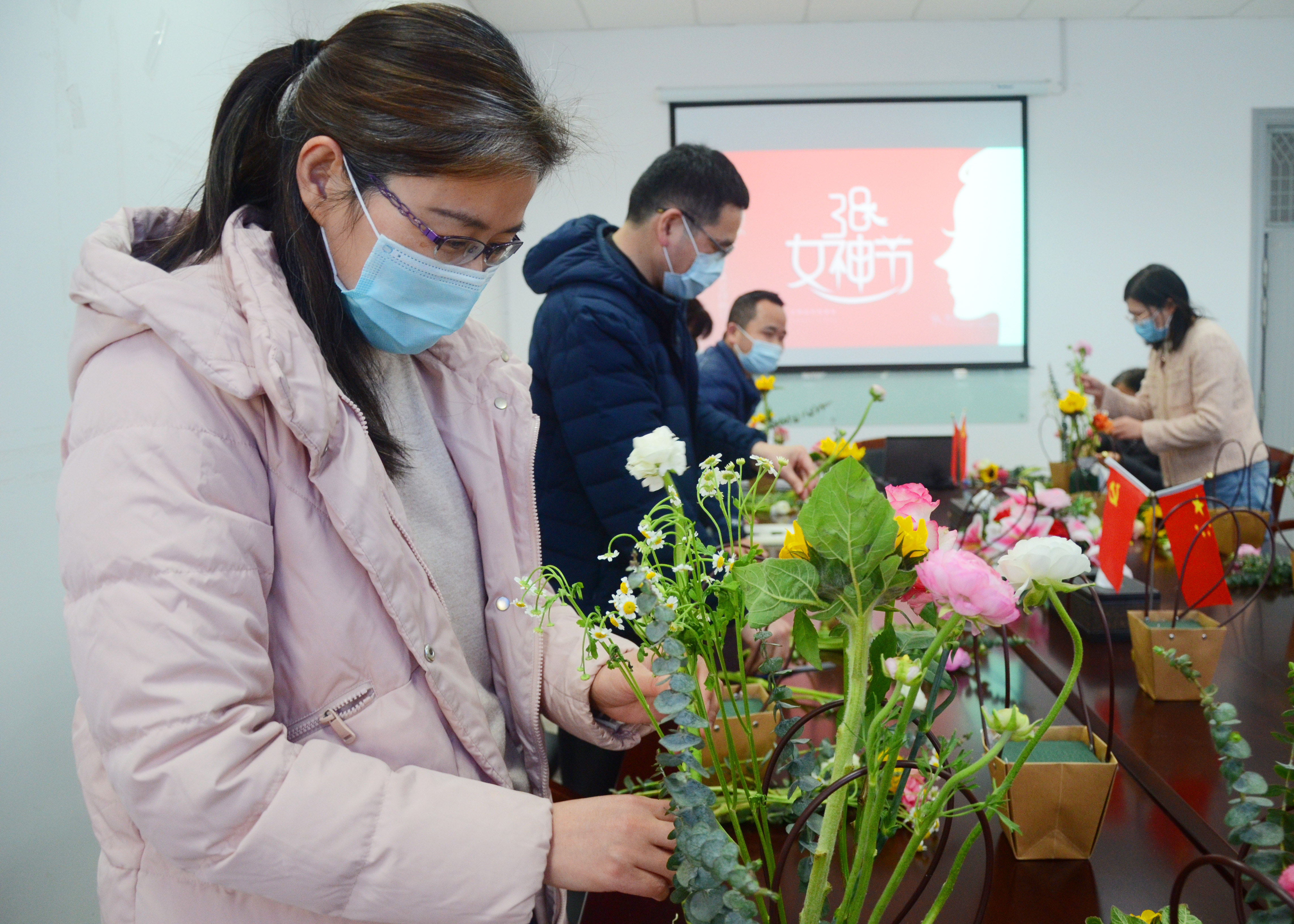 值此“三八”国际妇女节之际,经济与管理学院组织封闭隔离的女教师开展了“巾帼心向党 喜迎二十大”主题插花活动,3003新葡官方网站院长熊焰代表学院向广大女教职工表示节日的祝贺,充分肯定了女教职工在学院发展中的突出贡献,希望女教职工在学院高质量发展中再立新功。学院院长熊焰、学院党委书记侯建生、院党委副书记、副院长朱菁与广大教职工一道开展插花活动,歌颂新时代党的伟大成就,感谢党的恩情,表示一定要遵守防疫规定,认真做好育人和教学科研工作,为学院高质量发展撑起“半边天”,以优异成绩喜迎党的二十大胜利召开。