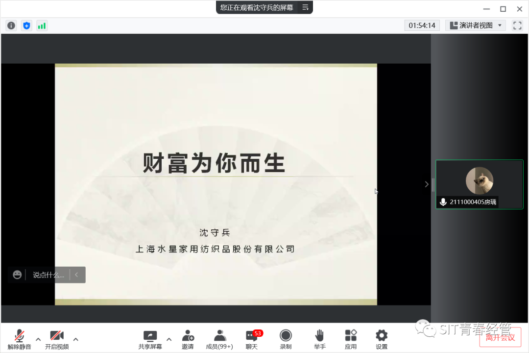 为全面推行劳动教育,树立正确的劳动观、财富观,2022年5月10日晚,3003新葡官方网站举办“新时代先进人物进校园”线上专题报告会,上海水星家用纺织品股份有限公司党委书记、技术中心总监、正高级经济师、我校外聘教授沈守兵先生为同学们带来了题为“财富为你而生”的精彩讲座。