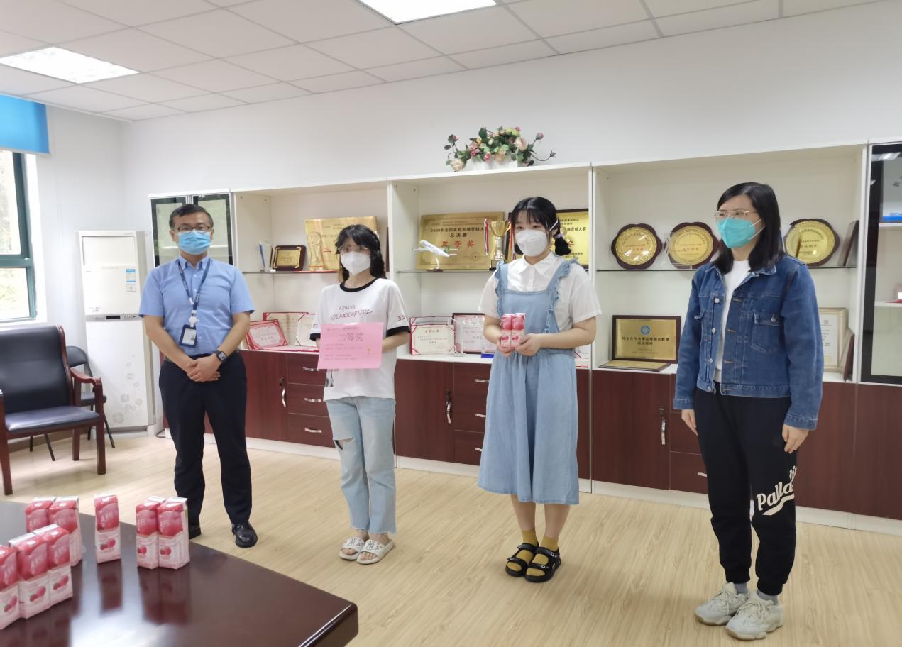 朱菁与尚经理分别为一等奖、二等奖作品颁奖,冯主管与鲍其雯分别为三等奖、参与奖代表颁奖,各位学生代表与颁奖人间隔留影。