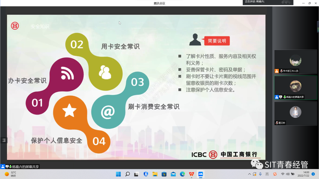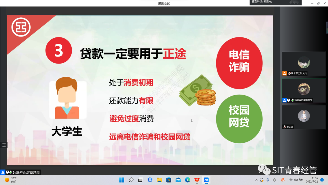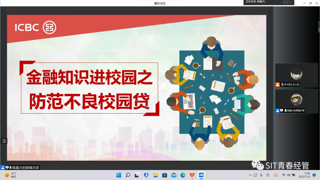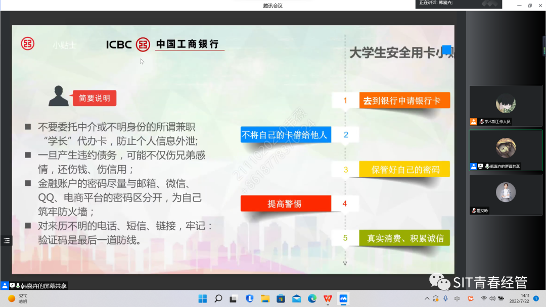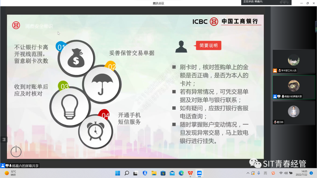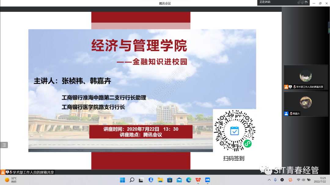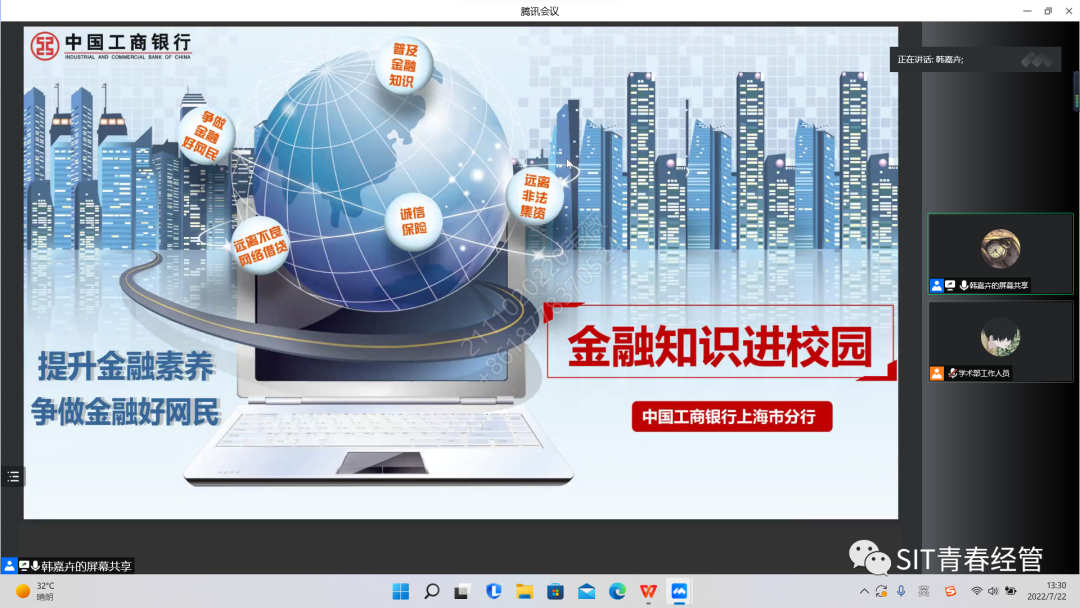 为帮助同学们树立正确的金钱观和价值观,做到理性消费,避免金融风险,2022年7月22日下午,3003新葡官方网站开展了“金融知识进校园”线上主题讲座。本次活动的主讲人为工商银行淮海中路第二支行行长助理张祯祎、工商银行医学院路支行行长韩嘉卉。