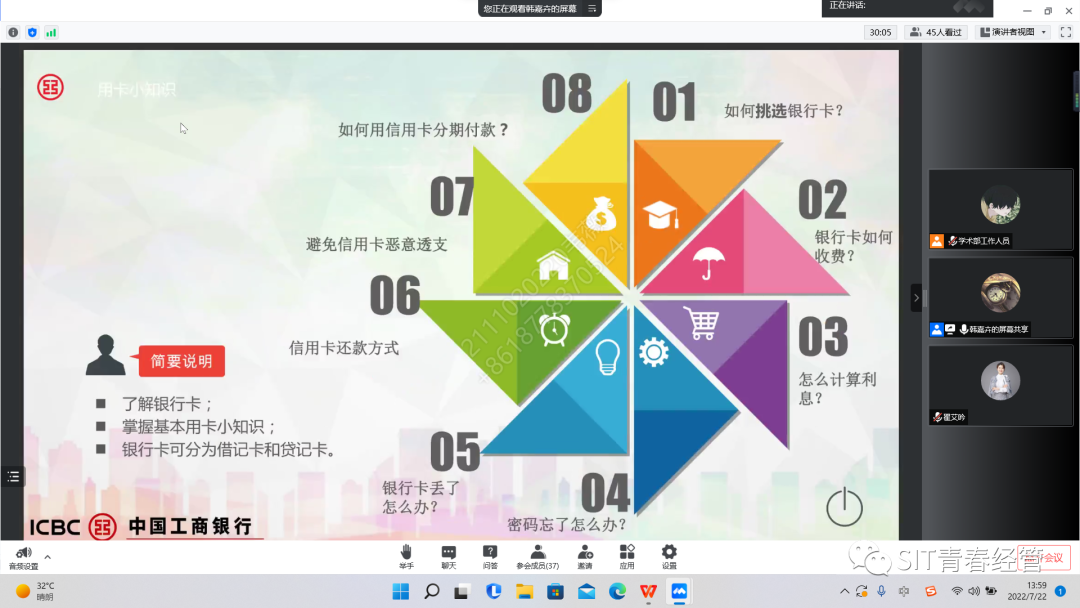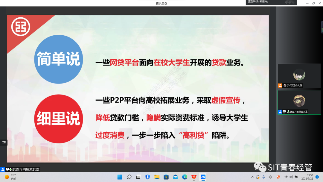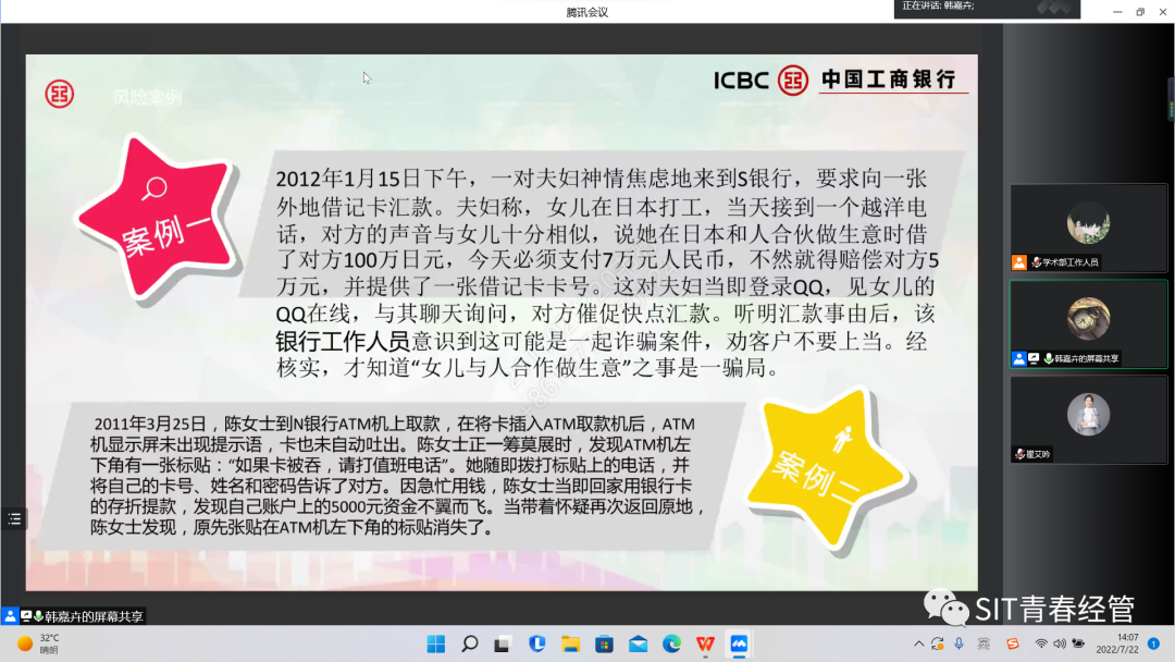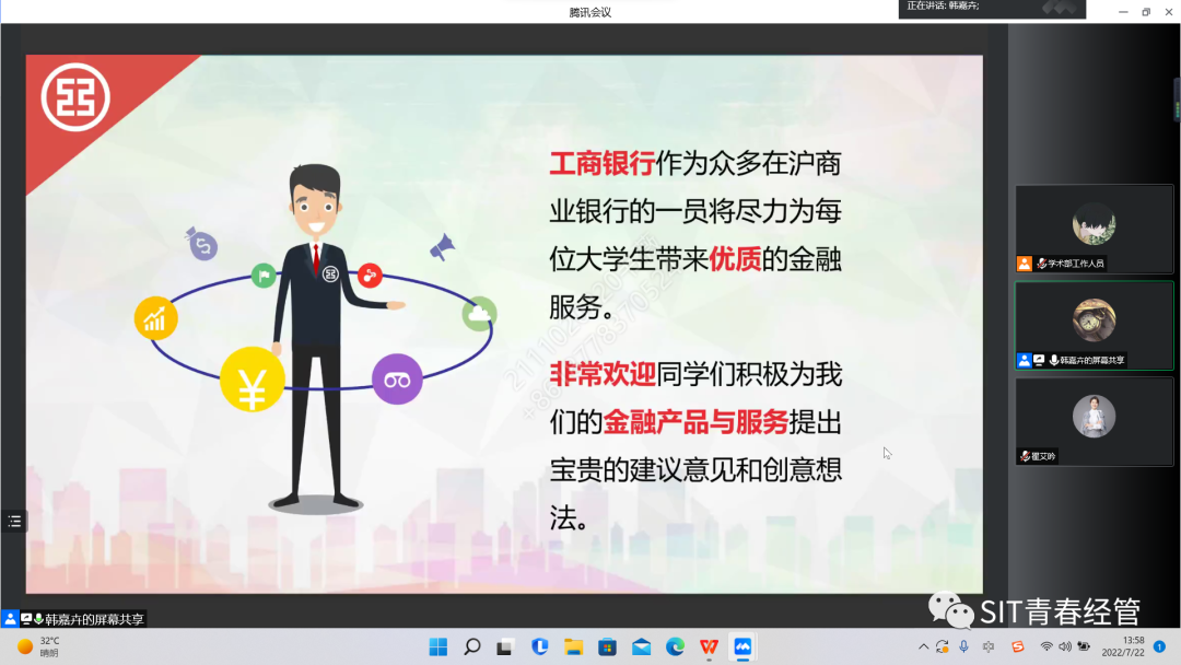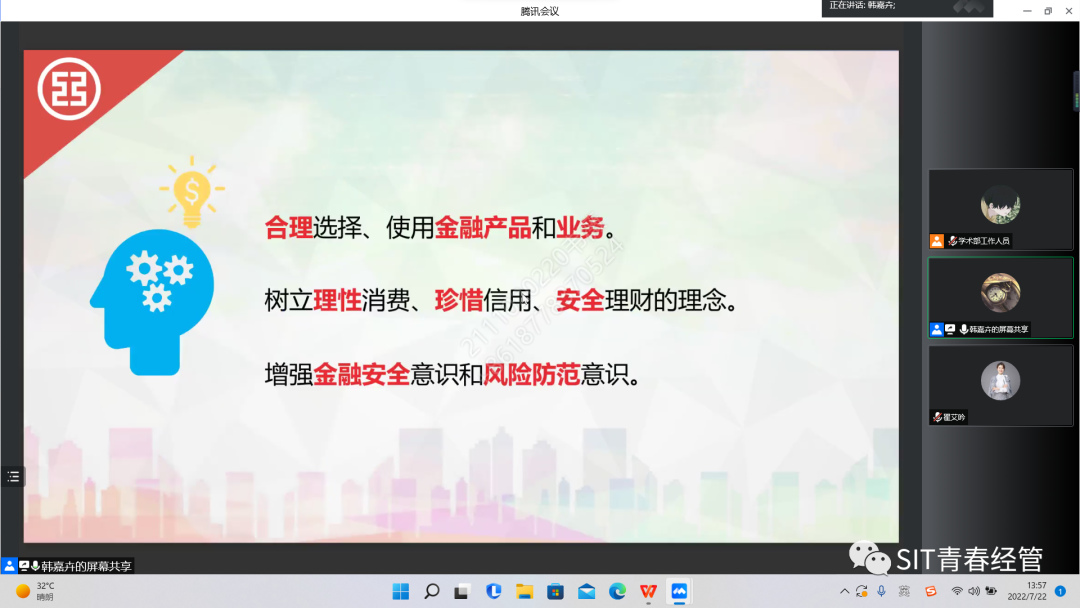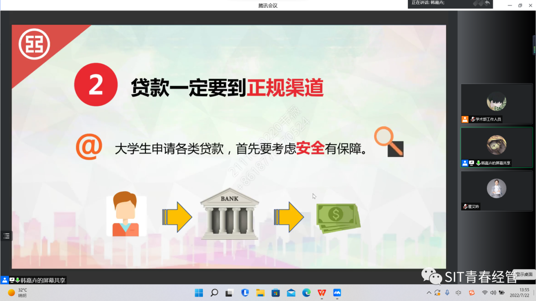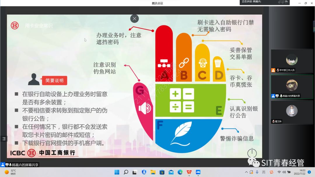为帮助同学们树立正确的金钱观和价值观,做到理性消费,避免金融风险,2022年7月22日下午,3003新葡官方网站开展了“金融知识进校园”线上主题讲座。本次活动的主讲人为工商银行淮海中路第二支行行长助理张祯祎、工商银行医学院路支行行长韩嘉卉。