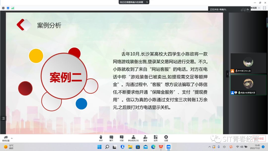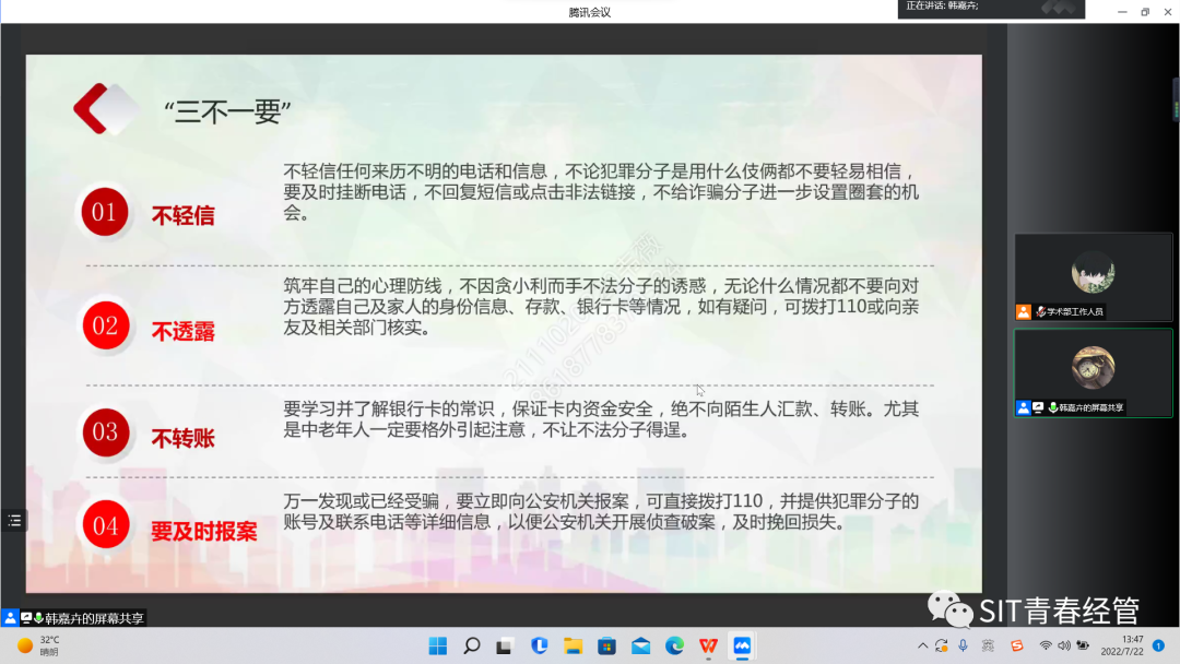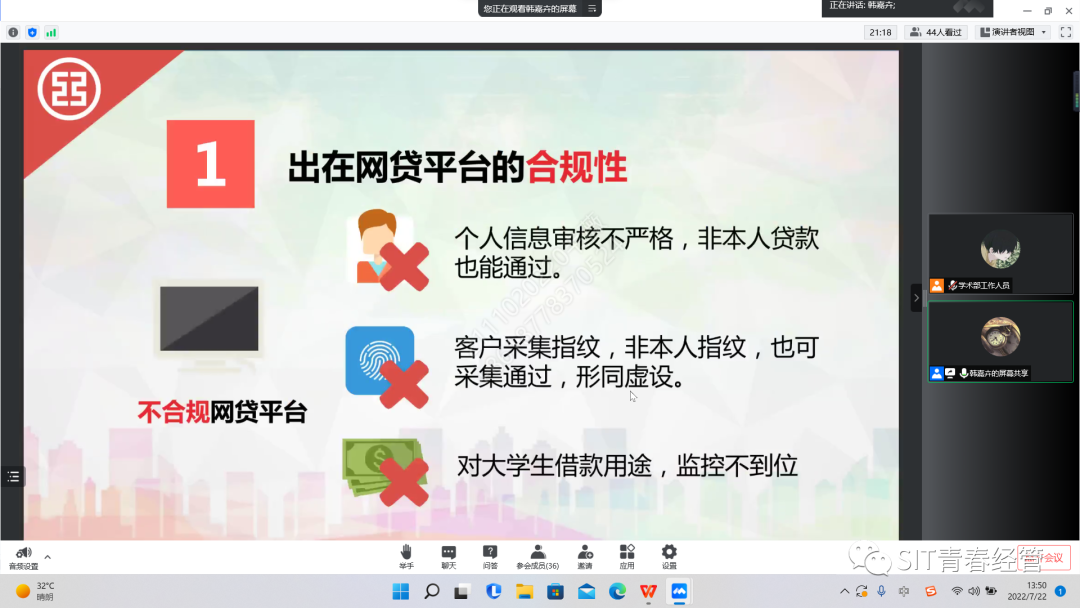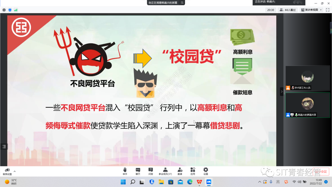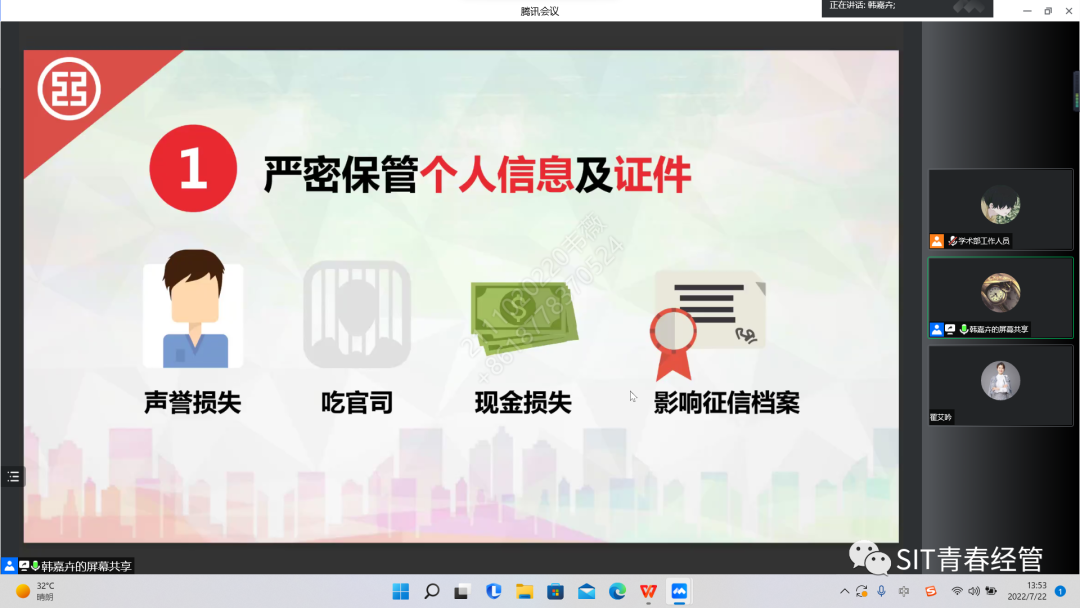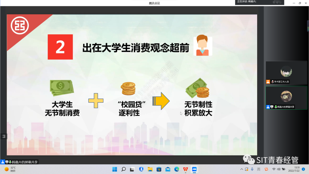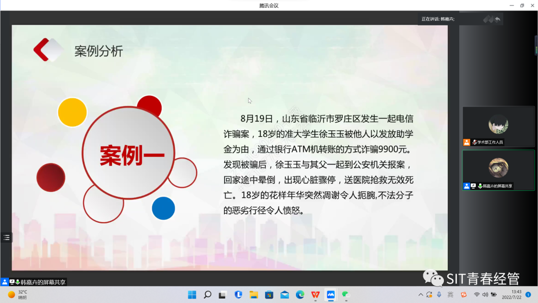 为帮助同学们树立正确的金钱观和价值观,做到理性消费,避免金融风险,2022年7月22日下午,3003新葡官方网站开展了“金融知识进校园”线上主题讲座。本次活动的主讲人为工商银行淮海中路第二支行行长助理张祯祎、工商银行医学院路支行行长韩嘉卉。