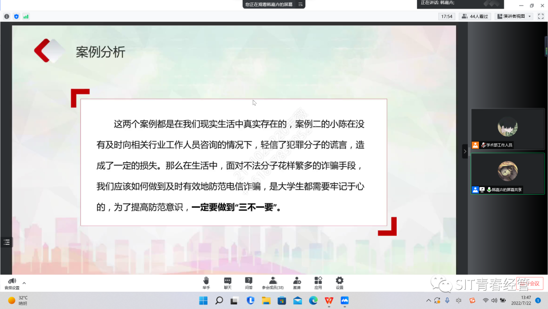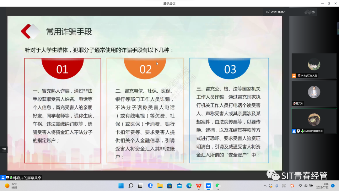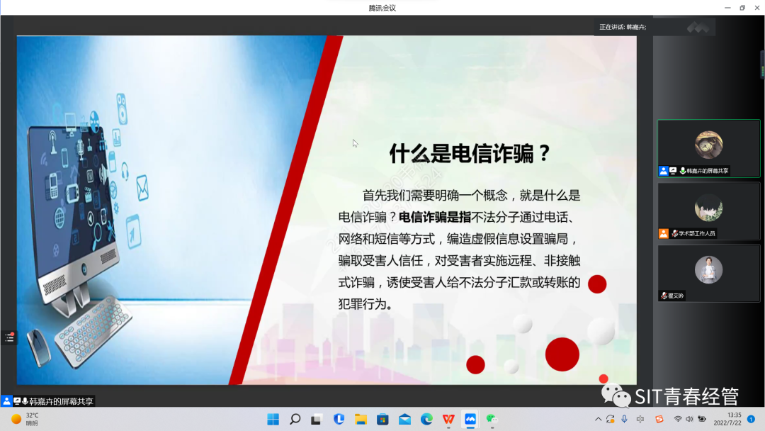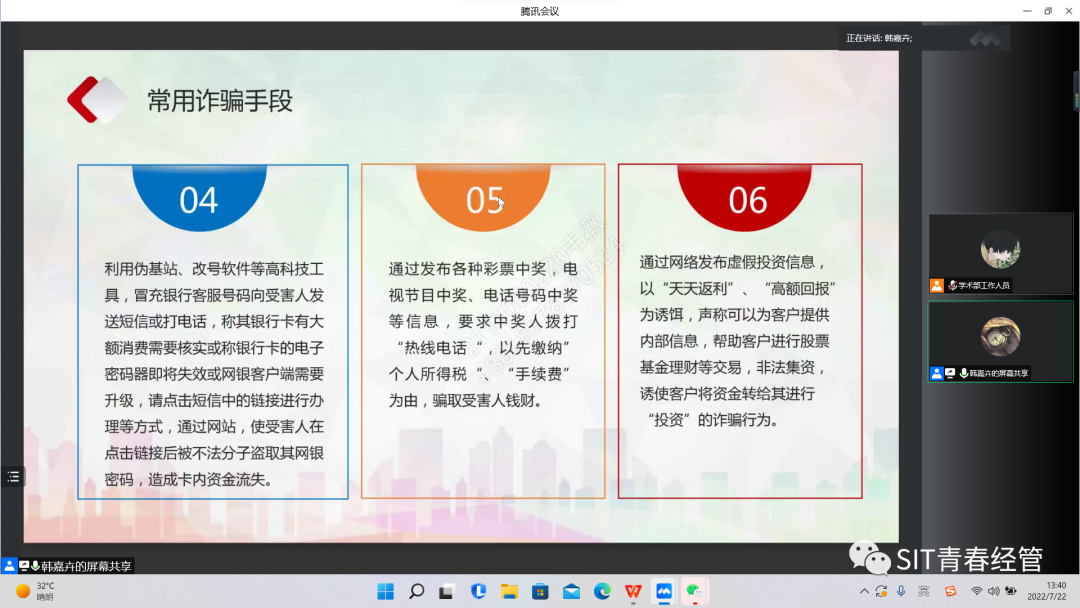 张祯祎行长助理从电信诈骗的概念着手,向同学们普及电信诈骗是指不法分子通过电话、网络和短信等方式,编造虚假信息设置骗局,骗取受害人信任,对受害人实施远程、非接触式诈骗,诱使受害人给不法分子汇款或转账的犯罪行为。
