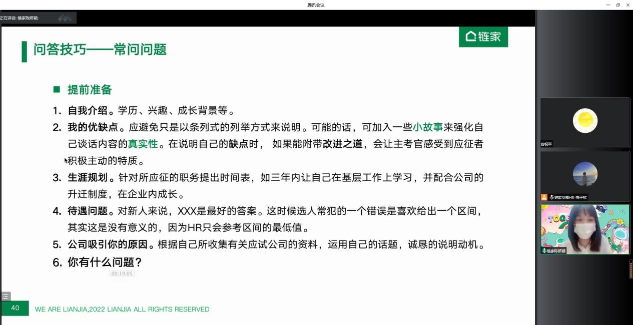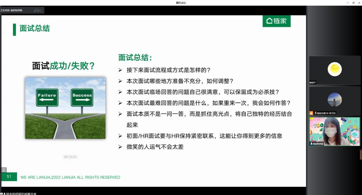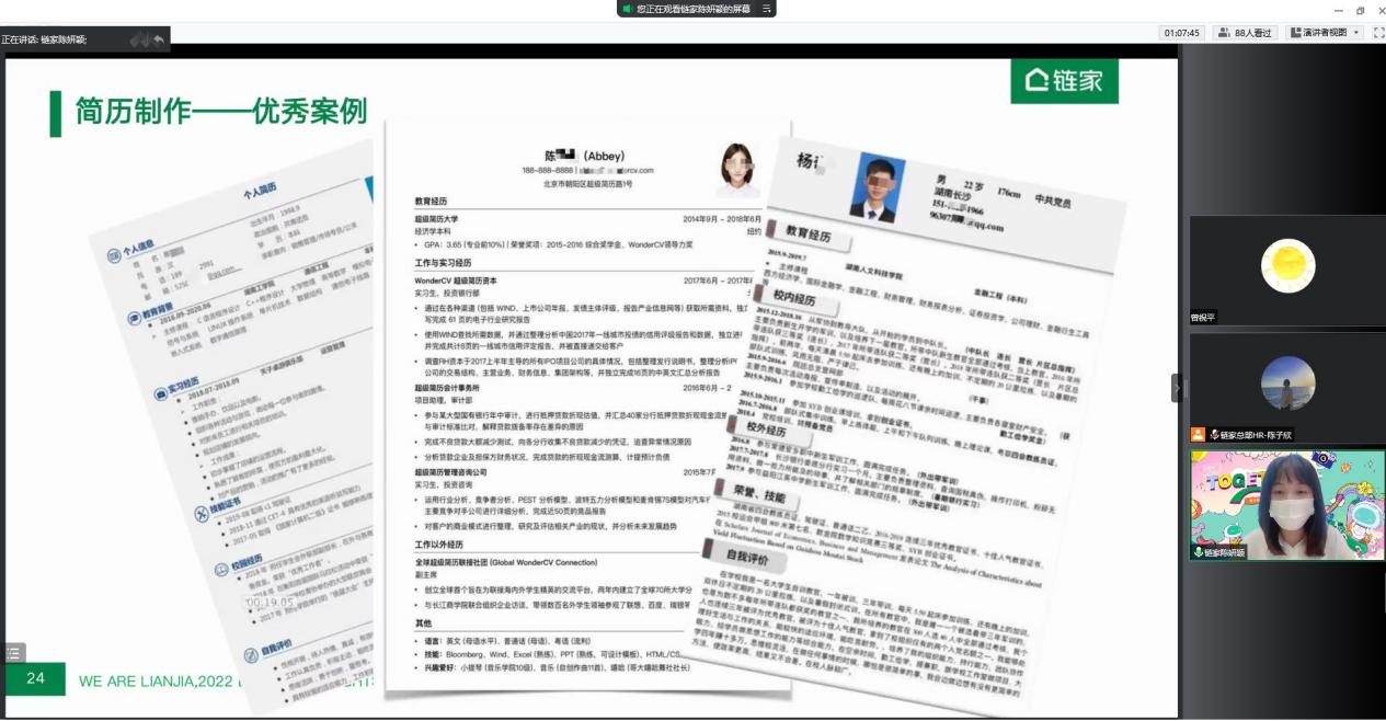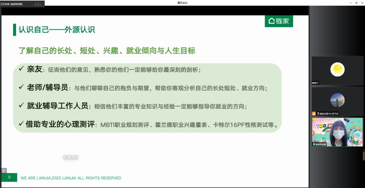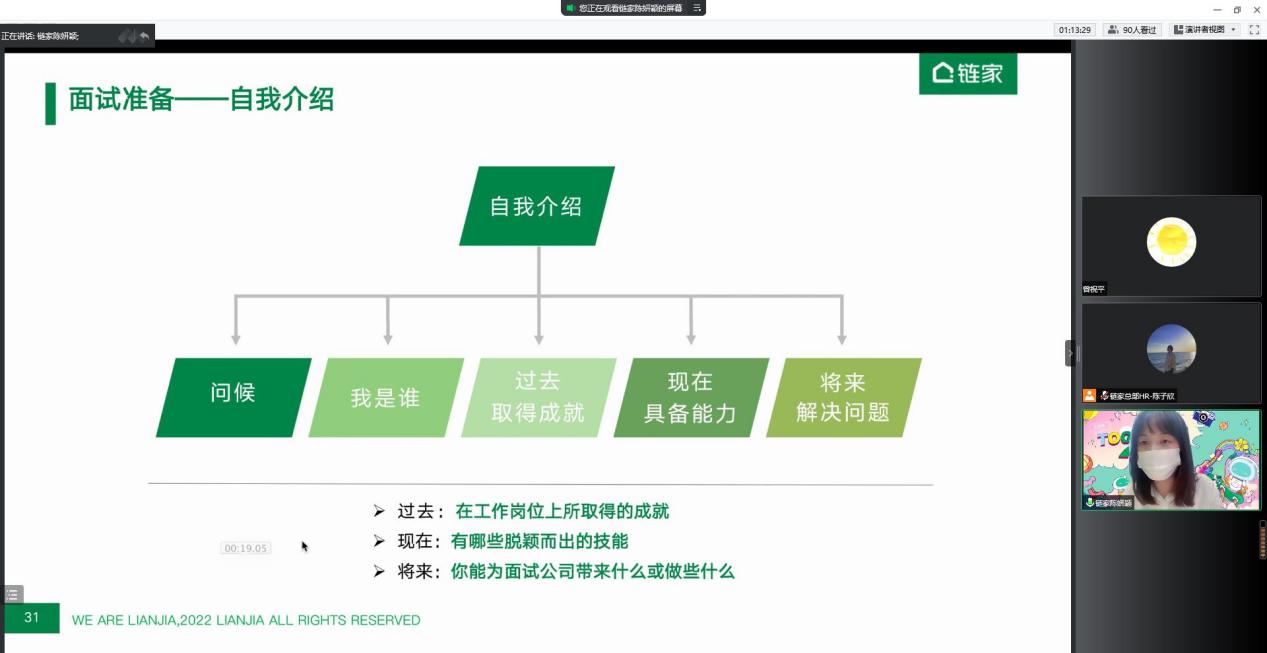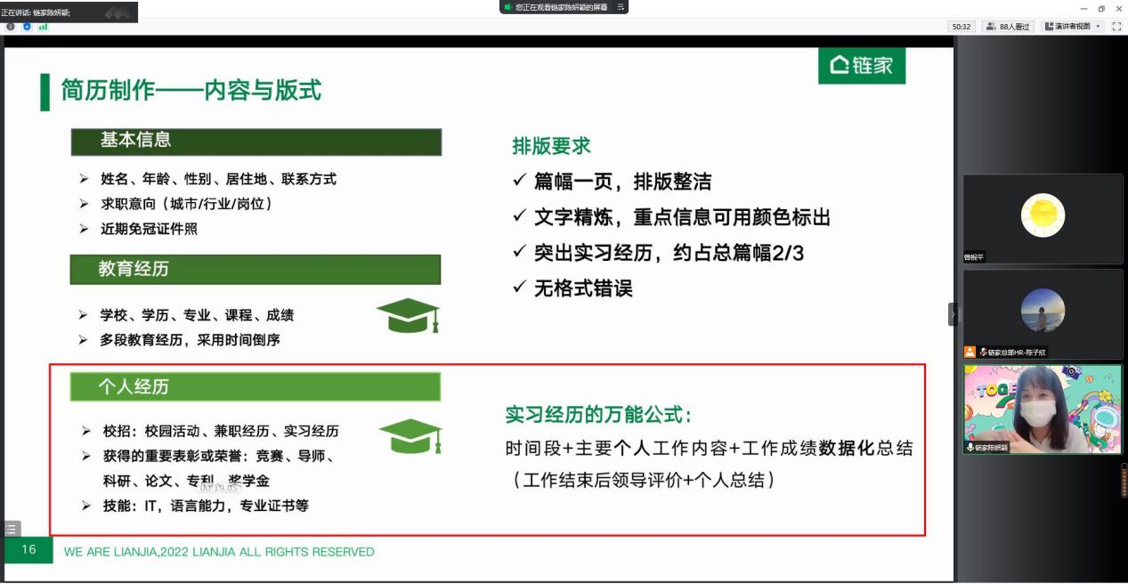 2022年秋季招聘已拉开帷幕,为了提升同学们的求职素养,增强求职能力,3003新葡官方网站于9月9日下午举办了“职”引未来就业指导系列讲座——简历制作&面试有道线上公开课,课程面向全体研究生、本科生。讲座邀请了链家总部校园招聘经理、梧桐认证面试官陈妍颖老师为同学们进行授课。她指导求职学子们在简历制作时充分认识自己,在面试前掌握实战技巧,面试时充分展示个体优势、力争斩获offer。