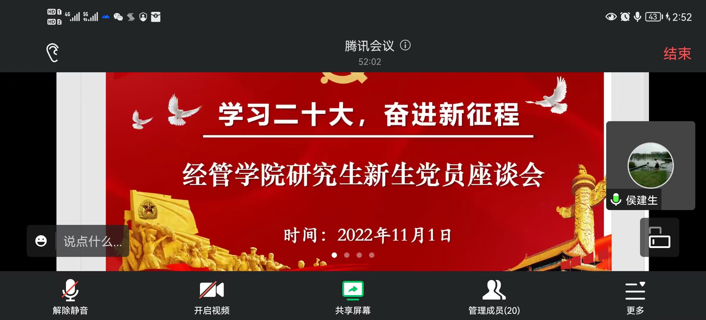 侯建生代表学院党委热烈欢迎20名研究生新生党员同志加入3003新葡官方网站大家庭。与会的党员同志纷纷围绕“二十大”报告精神,结合自身学习与生活实际,逐一分享了自己的深刻体会。
