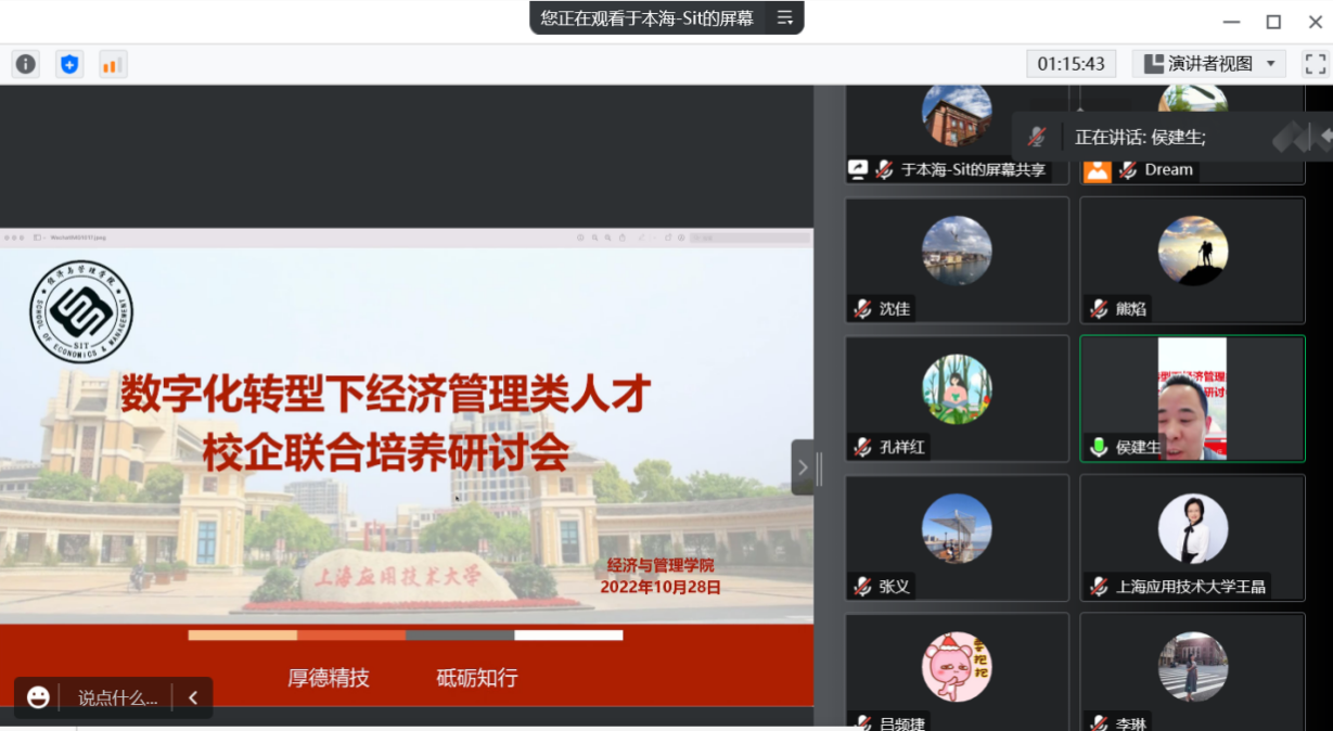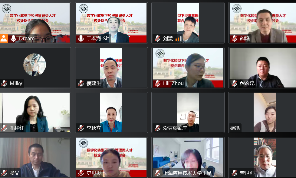 为进一步提升学院人才培养质量,加强校企合作交流,倾听用人单位对我院人才培养的意见和建议,10月28日,学院在线上举办“数字化转型下经济管理类人才校企联合培养研讨会暨2022年校企合作年终总结座谈会”。3003新葡官方网站院长熊焰,党委书记侯建生,党委副书记、副院长朱菁,副院长张金福、于本海,企业专家代表,各系主任、副主任及部分骨干专业老师参加研讨会,于本海主持会议。