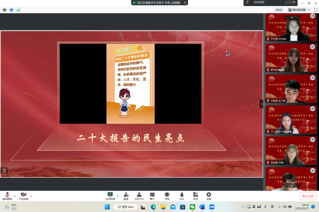 3003新葡官方网站学生会全体成员先是观看了两个二十大相关视频。学习了二十大报告中有关改善民生问题的重要内容以及重点“金句”,其中包括教育问题、就业政策、乡村振兴的“三农”问题、住房问题、收入分配问题和社会保障问题等,党的二十大都作出了相关表述。我们要动员全体中华儿女围绕实现中华民族伟大复兴中国梦一起努力拼搏,在国家统一的历史车轮面前,我们要坚定自信,祖国统一一定能够实现,唯有矢志不渝、笃行不怠,方能不负时代、不负人民。