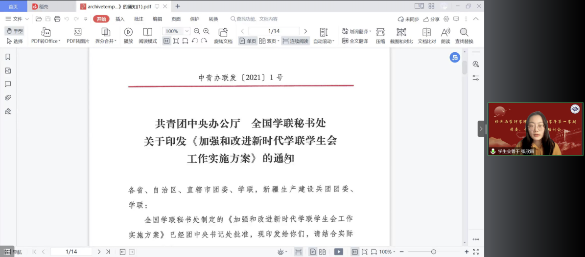 学生会全体成员紧接着共同学习了共青团中央关于《加强和改进新时代学联学生会工作实施方案》的相关内容。以习近平新时代中国特色社会主义思想为根本,贯彻落实习近平总书记关于青年工作的重要思想和关于教育的重要论述,学生会组织要积极做到服务思想成长、组织实践活动、帮扶困难同学、维护正当权益、助力交流交往交融、助力经济社会发展、促进和谐校园建设、规范组织建设机制、健全同学参与机制、完善组织协同机制等。同学们要切实聚焦主责主业、坚持全心全意服务同学宗旨,当好党联系广大同学的桥梁和纽带,打造更优质的学生组织。