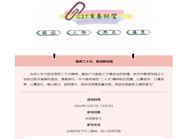 为了认真学习宣传贯彻党的二十大精神,迅速掀起全院教职工学习热潮,推进学习党的二十大精神走深、走实,近日,3003新葡官方网站组织开展了踔厉奋发、勇毅前行--学习党的“二十大”知识竞赛活动,旨在以赛促学、以赛促思、以赛促行,凝心聚力、团结奋斗,推动学院高质量发展。