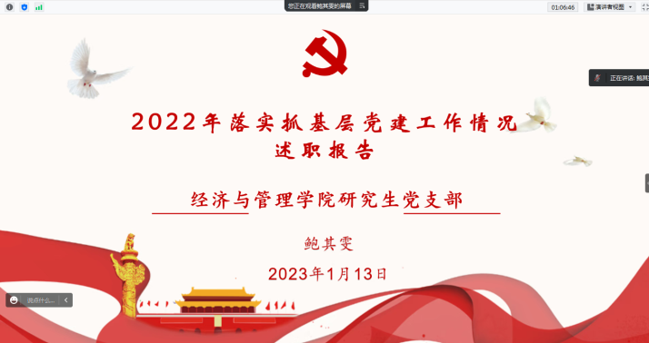 会前,学院10位党支部书记严格按照校党委组织部工作部署要求,认真总结分析并提交了述职报告。会上,各支部紧紧围绕学习贯彻习近平新时代中国特色社会主义思想和党的二十大精神、突出在******中广泛深入开展党建引领社会动员、以基层党组织建设为重点加强组织体系建设情况等重点工作和中心任务,分别从政治引领、支部建设、志愿服务、规范建设、特色工作等方面对党支部2022年各项工作的开展情况进行述职,总结了经验做法,挖掘了特色亮点,还深入查摆分析支部工作中存在的突出问题和差距不足,提出了改进的思路和2023年努力的方向。