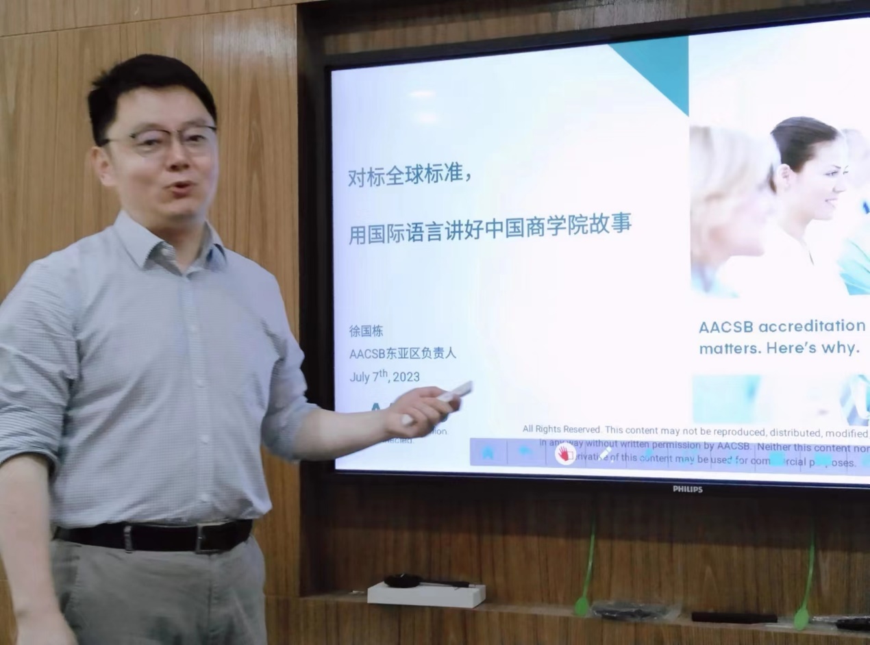 徐国栋以“对标全球标准,用国际语言讲好中国商学院故事”为主题,详细介绍了AACSB的组织概况、价值观、认证原则和标准、成员学习与发展机会、认证流程等内容,并对国内外高校认证情况进行解读。