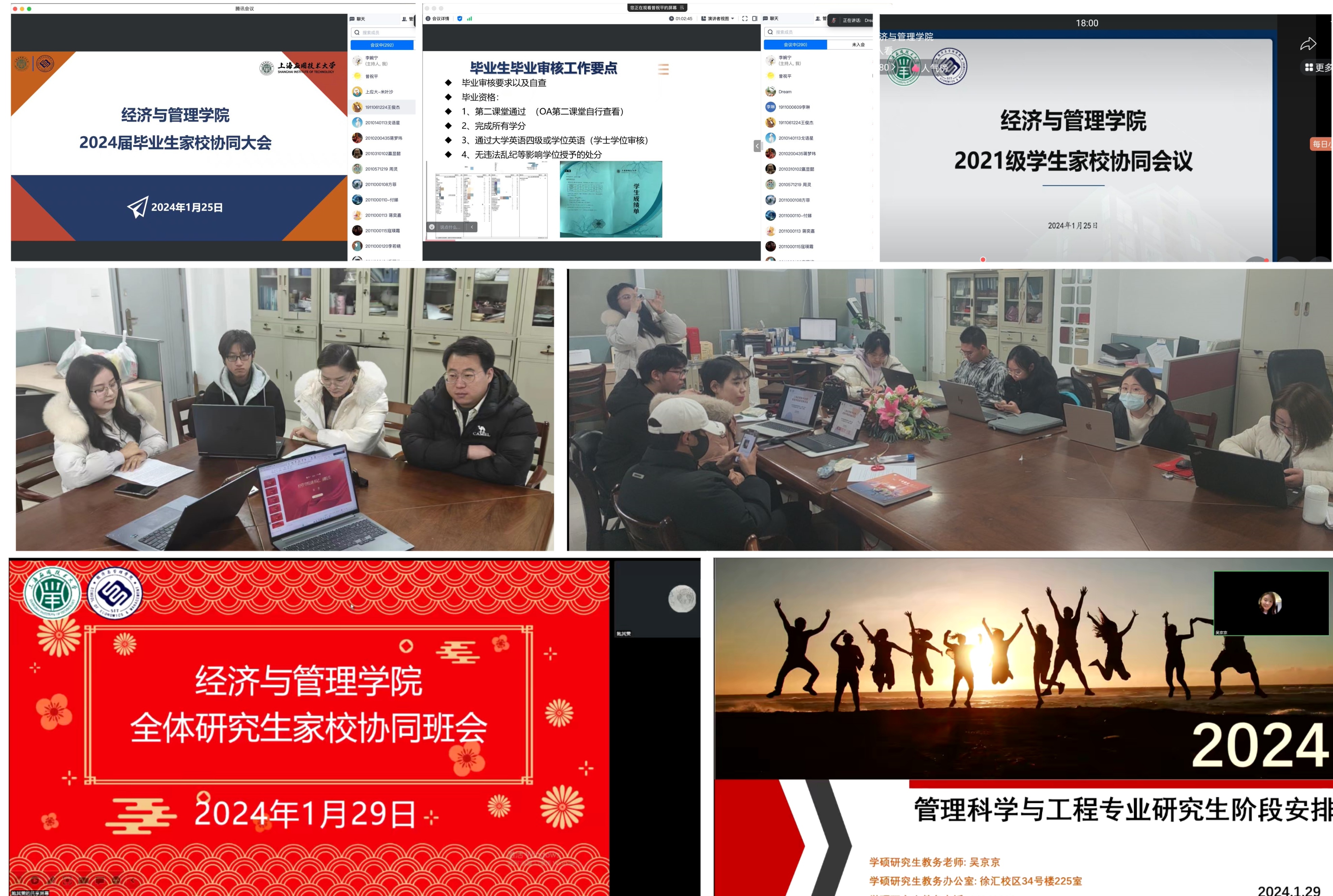 各年级12位辅导员联合本硕教学秘书分别从学业现状与要求、假期安全防诈、职业生涯规划、家校协同心灵助力、毕业论文答辩与学位申请等各方面详细宣讲,引导全体学生度过一个充实、安全、幸福的春节假期。