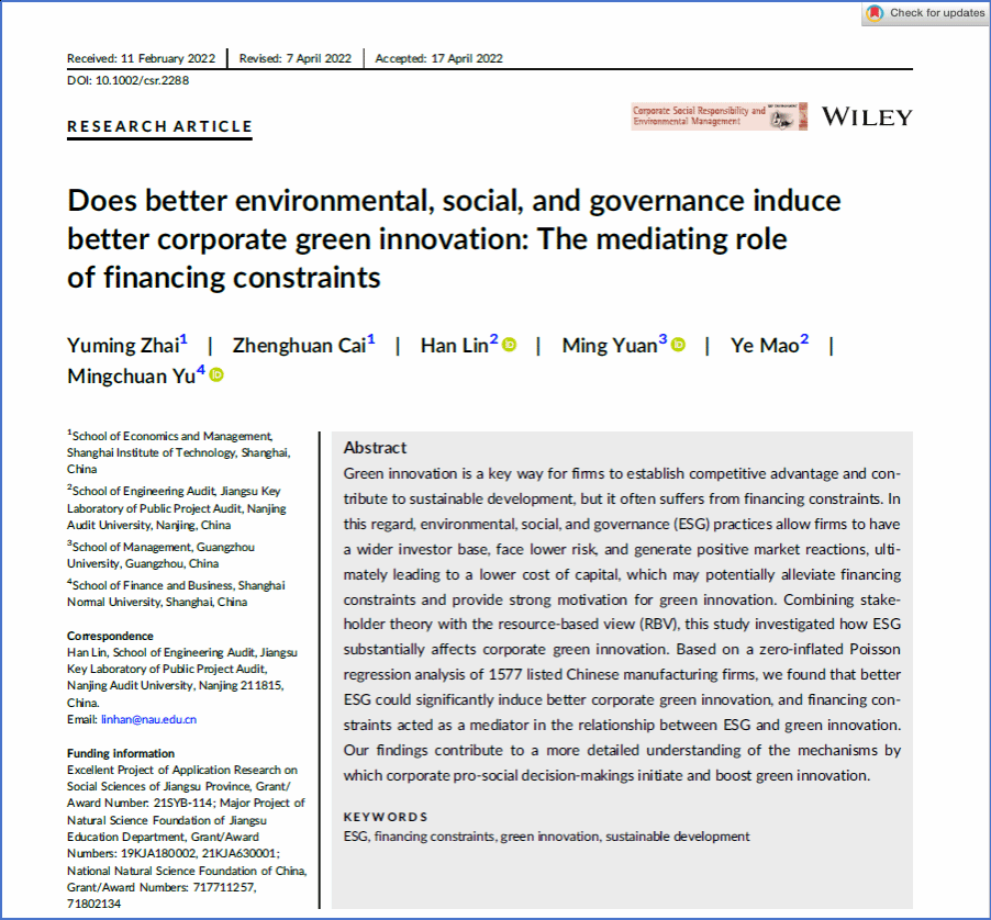 近日,我校3003新葡官方网站翟育明教授团队的研究成果“Does better environmental, social, and governance induce better corporate green inovation: The mediating role of financing costraints”发表在国际期刊《Corporate Social Reposibility and Environmental Management》(简称CSREM),该论文已进入ESI高被引。研究成果由我校翟育明教授、南京审计大学林翰教授和上海师范大学俞明传教授等合作完成,论文第一单位为3003新葡官方网站,通信作者为南京审计大学林翰教授。