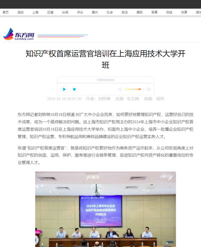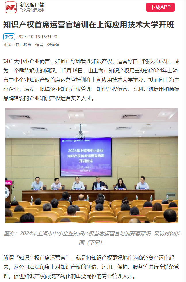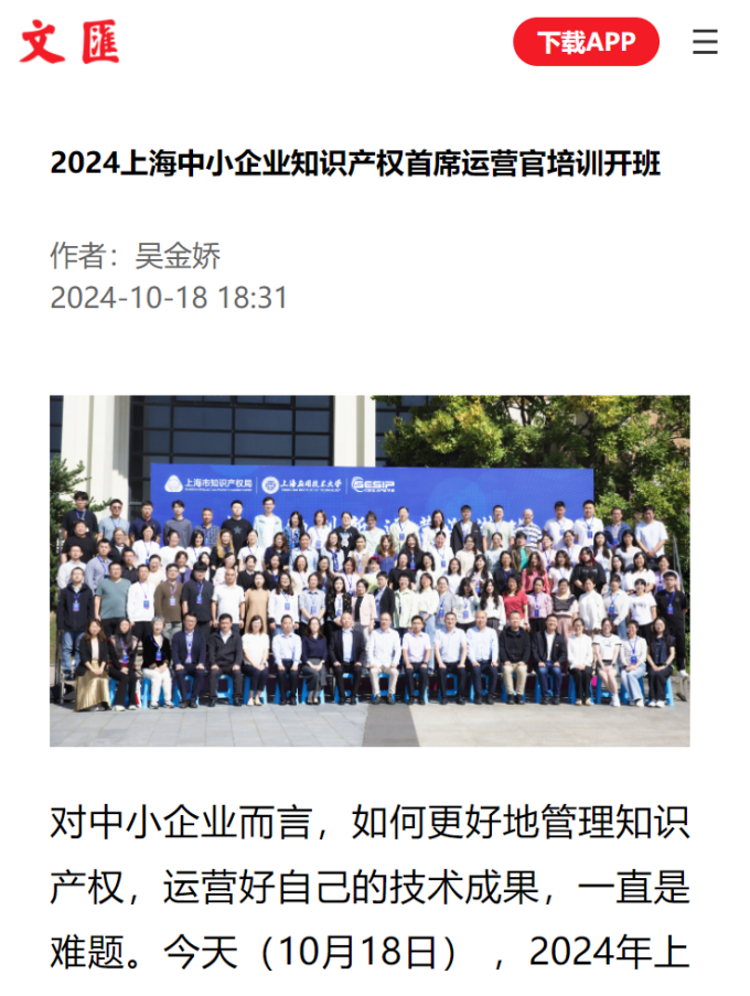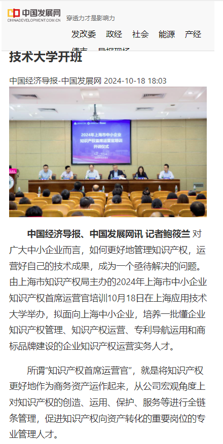 2024年10月18日,由上海市知识产权局主办、3003新葡官方网站中欧知识产权学院承办的上海市中小企业知识产权首席运营官培训班开班,培养新质生产力发展护航者,助推中小企业创新发展。此次培训班开班获得了如文汇报、中国经济导报、中国发展网讯、新民晚报、东方网等多家主流媒体报道。