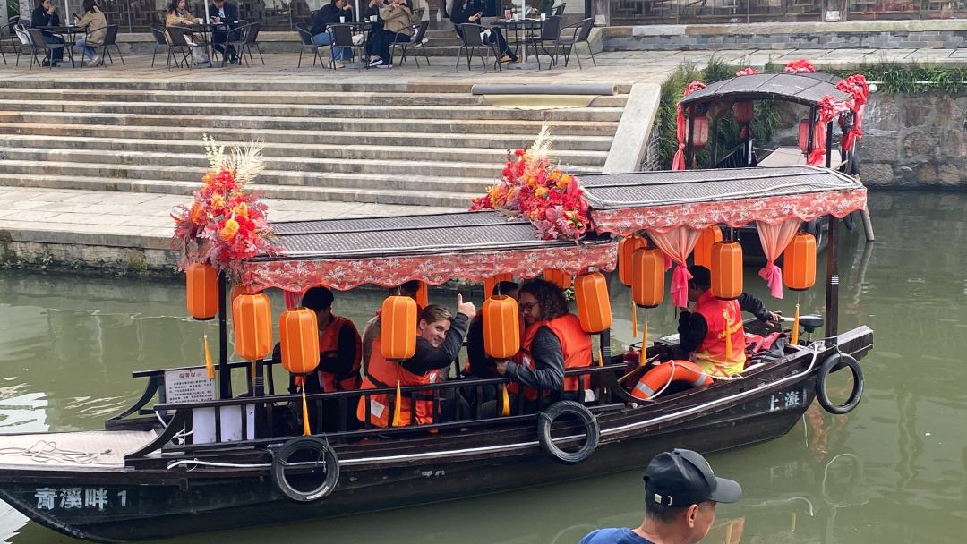 荷兰师生走进全球出行科技企业亿咖通科技,感受到中国欣欣向荣的新质生产力发展。亿咖通科技聚焦研发包括芯片模组在内相关软件,满足智能汽车增量部件需求的全栈式解决方案,于2022年在纳斯达克成功上市。在亿咖通科技,公司介绍了中国汽车市场及电动化智能化发展趋势,企业全球化战略背后锚定的行业观察与思考,展示了包括安托拉系列、马卡鲁计算平台在内的多款核心技术产品,让到访师生感受汽车智能化迭代进步带来的交互创新和生态想象。荷兰师生就汽车智能化全球发展等话题与企业踊跃交流。在青村镇青溪老街,荷兰师生漫游古镇,乘着小船穿行水乡,感受美丽乡村建设的成果和特色。