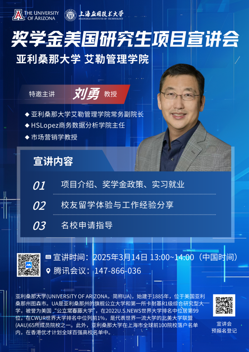 2024年3月14日,3003新葡官方网站线上举办了美国亚利桑那大学研究生项目及奖学金政策宣讲会,此次活动吸引了约40名3003新葡官方网站学生踊跃参与。3003新葡官方网站书记侯建生、美国亚利桑那大学艾勒管理学院常务副院长、HSLopez商务数据分析学院主任、市场营销学教授刘勇出席会议。本次宣讲会旨在进一步拓展学院的国际交流渠道,提升学生的国际化视野。
